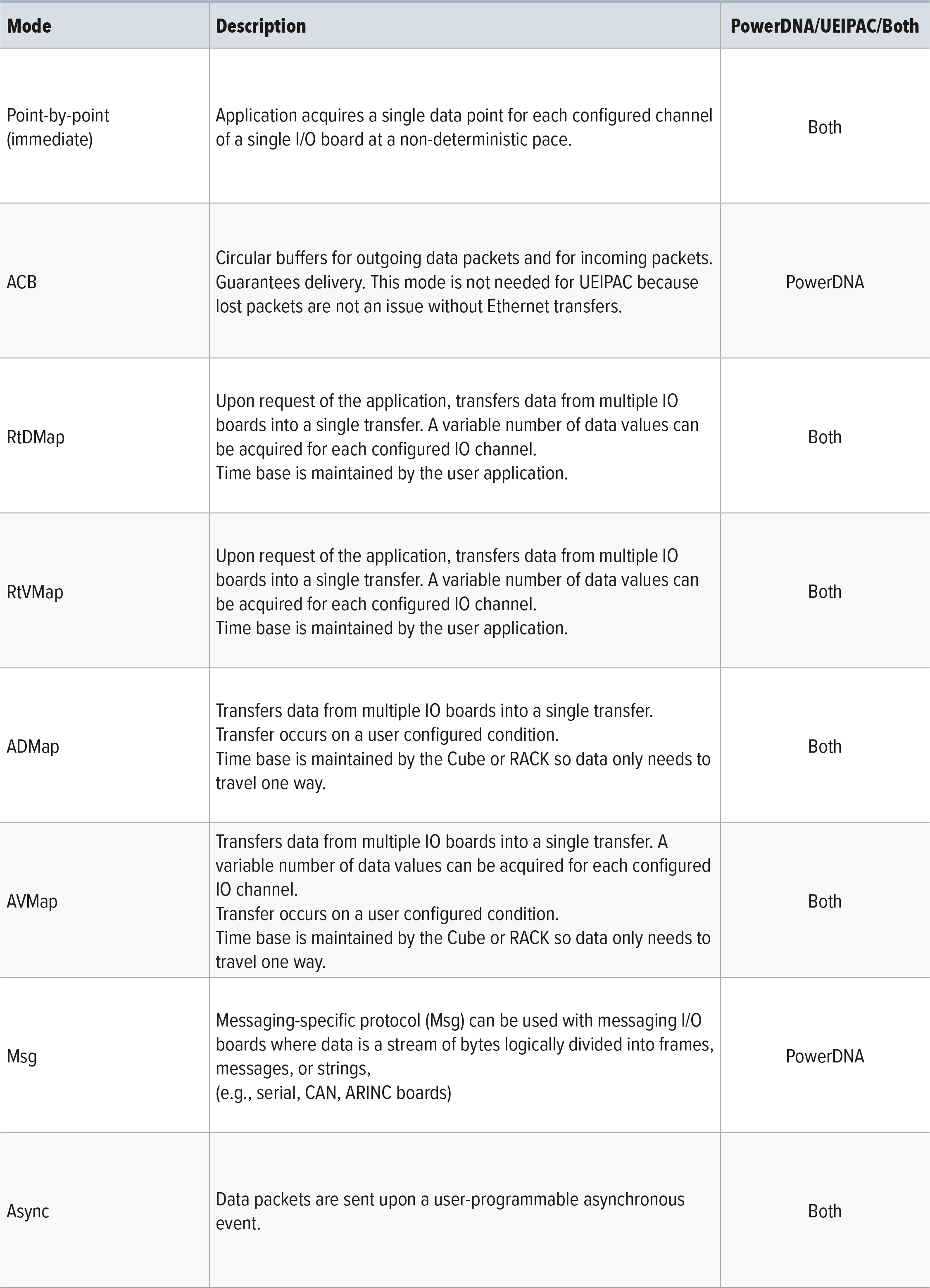 UEI offers data acquisition and control modes that satisfy an assortment of application requirements. A summary of these modes is provided below. See FAQ | Data Acquisition Modes for more detailed information.